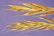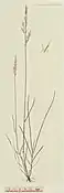 Багаторічна трав'яниста рослина 30–75 см завдовжки. Листові пластини ниткоподібні, еліптичні в розрізі, 0.6–1.1 мм завширшки, поверхні шершаві, волосаті з обох сторін. Суцвіття — відкрита волоть 4.5–13 см завдовжки; гілки шершаві, родючі колоски на ніжках. Колоски містять 4–8 родючих квіточок; зі зменшеними квіточками на вершині. Колоски довгасті, стиснуті з боків; 7–7.5 мм завдовжки; розпадаються у зрілості під кожною родючою квіточкою. Колоскові луски подібні, коротші, ніж колоски; верхня колоскова луска ланцетна; 3.5–4.5 мм завдовжки; 0.8–0.9 довжина суміжної родючої леми; кілі відсутні; верхівки гострі. Родюча лема ланцетна, 4.2–4.9 мм завдовжки; поверхня леми гола або запушена; вершина гостра; остюк основної леми 2–2.5 мм завдовжки. Верхівкові стерильні квіточки нагадують родючі, хоч і недорозвинені. Пиляків 3[3].