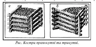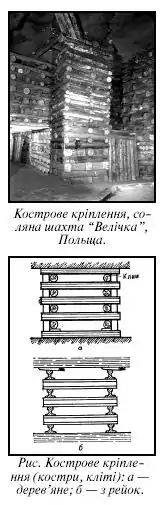 Костри (кліті) складають з дерев'яних або металевих балок довжиною 0,7-1,2 м. Як дерев'яні елементи використовують рудникові стояки і бруси, балки для металевих кострів — відрізки старих рудникових рейок, двотаврів або спеціального взаємозамінного профілю (СВП). За кордоном (наприклад, у ФРН) на окр. шахтах застосовують кострові кріплення з нерозбірних пересувних кострів на санчатах, забезпечених розвантажувальними пристроями, а також саморухомих гідрофікованих кострів, що складаються з двох гідравлічних стояків постійного опору, встановлених на одній основі. Кострове кріплення як засіб охорони виробок застосовують при безціликовому відпрацюванні пластів. За кордоном кострове кріплення витісняється досконалішим засобом охорони гірничих виробок — литими смугами з швидкотверднучих матеріалів.