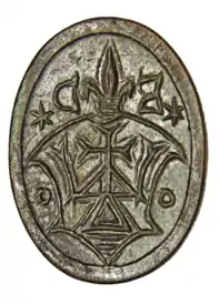 | Опис герба: В червоному полі на польському щиті срібний тризубець. | |