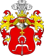 Щит увінчаний дворянським шоломом і короною. Намет на щиті червоний підкладений золотом. Нашоломник: три страусиних пір'їни.
