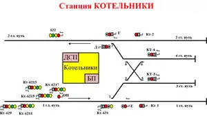 Станція з колійним розвитком — 6 стрілочних переводів, перехресний з'їзд, 2 станційні колії для обороту і відстою рухомого складу і 2 колії для відстою рухомого складу.