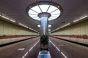 Конструкція станції — двопрогінна колонна мілкого закладення (глибина закладення — 15 м) з острівною прямою платформою.
