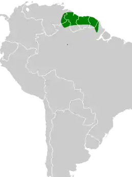 Основна частина його ареалу знаходиться в низинних лісах Гаяни, Суринаму та Французької Гвіани, але також трапляється на південному сході Венесуели і дуже локально на північному сході Бразилії.