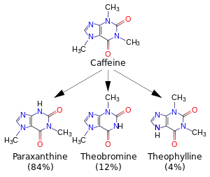 Кофеїн розкладається в печінці на три диметилксантинові речовини, кожна з яких має свій вплив на організм:
