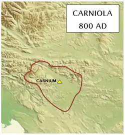 Після падіння Західної Римської імперії (476), Крайна увійшла до Королівства Італія і (493) була складовою частиною Королівства остготів. Між верхів'ями річок Сави і Сочи жили карни, з кінця шостого століття слов'яни заселили регіон за назвою латинських письменників Carnia або Carniola тобто «маленька Карнія», або основна Карнія. Пізніше назва була змінена на слов'янську Крайна, Краньська, або, на німецьку, Chrainmark, Krain. Нові жителі підкорялися аварам, але скинули ярмо, і приєдналися до великої слов'янської держави Само.