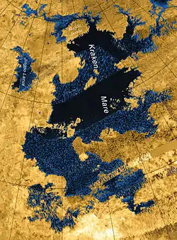 Північна полярна зона Титана (полюс у центрі). Кракенове море у нижній правій частині зображення.