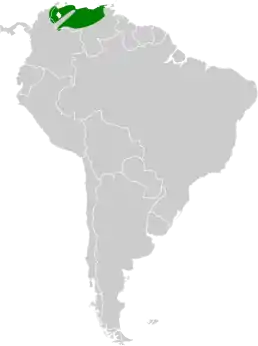 Вид поширений на півночі Венесуели (на північ від Оріноко) і в кількох місцях на північному сході Колумбії (західне передгір'я Сьєрра-де-Періха від Монтес-де-Ока на південь до Фонсеки та на схід від Анд від сходу Норте-де-Сантандера з півдня на північний захід від Арауки. Його аревл розривається на дві частини горами Кордильєра-де-Мерида. Мешкає у галерейних лісах в льяносі, а також в низинних листяних та вічнозелених лісах, а також передгір'ях до 800 м у Венесуелі та 500—1500 м у Колумбії. Він рідко трапляється дальше ніж на 250 м від лісового покриву.