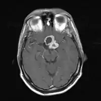 ![]() Знімок МРТ головного мозку. На аксіальній томограмі визначається новоутворення з кістозним та солідним компонентами - краніофарингіома Знімок МРТ головного мозку. На аксіальній томограмі визначається новоутворення з кістозним та солідним компонентами - краніофарингіома | |
