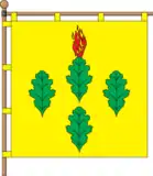 На жовтому квадратному полотнищі чотири зелених дубових листки, один, два і один, з верхнього виходить червоне полум'я.