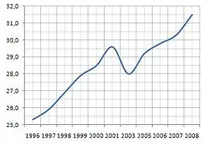 | 25,3 | 28,5 | 29,6 | 28,0 | 29,2 | 29,2 | 29,8 | 30,3 | 31,5 | 32,3 | 33,8 |