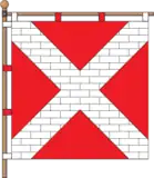 На квадратному червоному полотнищі білий мурований косий хрест.