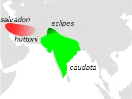 - A. c. caudata (Dumont, 1823) — східний Пакистан, Індія (за винятком Гімалаїв і північного сходу), південно-західний Непал, острів Памбан і острови Лакшадвіп;