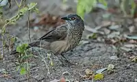 Довжина птаха становить 22-25 см, вага 52-80 г. Забарвлення переважно сірувато-коричневе. Горло і груди поцятковані білими плямками, на голові білуваті края пер створюють лускоподібний візерунок. Крила бронзово-коричневі. Дзьоб чорний, лапи сіро-чорні, очі жовті. Виду не притаманний статевий диморфізм. Молоді птахи мають подібне забарвлення, але більш коричневе і однотонне. Очі у них карі.