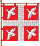 Квадратне полотнище поділене білим прямим хрестом, плетеним з лози. В кожній частині по білій качці, що злітає вгору і в бік древка. Ширина рамена – 1/6 від ширини прапора.
