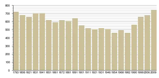 Динаміка населення (base Cassini de l'EHESS pour les nombres retenus jusque 1962[3], base Insee à partir de 1968 (population sans doubles comptes puis population municipale à partir de 2006)[4] · [5] ):