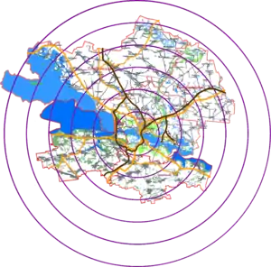 Мапа агломерації з лініями кожні 10 км від центра Кременчука, залізницями та автошляхами