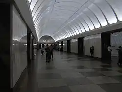Присвячене темі селянської праці. Колійні стіни, а також стіни між центральним залом і платформами облицьовані світлим мармуром. Стіни між центральним залом також прикрашені панно в техніці римської мозаїки (художники Н. І. Андронов, Ю. А. Шишков). Підлогу викладено сірим і чорним гранітом. Станція освітлюється люмінесцентними світильниками, прихованими в нішах за карнизом склепіння станції.