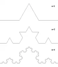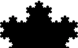 Три копії кривої Коха, побудовані (вістрями назовні) на сторонах правильного трикутника, утворюють замкнену криву, так звану сніжинку Коха[1][3][2]. Крива Коха задається такою системою ітераційних функцій: