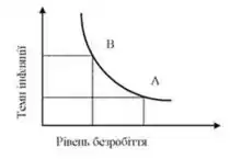 Крива Філліпса відома з 1958 р., коли економіст О.У Філліпс опублікував роботу «Зв'язок між безробіттям і темпом змін грошової заробітної плати у Сполученому Королівстві в період 1861—1957 рр.». Він показав зв'язок між рівнем безробіття і темпами росту середньої заробітної плати. Безробіття високе, коли заробітна платня зростає повільніше, і безробіття падає, коли заробітна платня зростає швидше. Високий рівень інфляціїї зазвичай супроводжується низьким рівнем безробіття і навпаки.