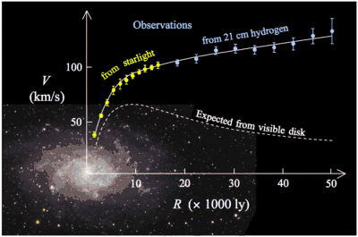 Якщо припустити, що класична механіка є правильною, а більшість маси галактики зосереджена в балджі поблизу центру, то швидкість обертання зір і газу в дисковій частині має зменшуватися зі збільшенням відстані від галактичного центру (біла пунктирна лінія на малюнку).