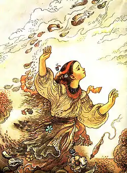 Над двором тричі пролітає зграя качок, скидаючи дівчині по пір'їні та закликаючи полетіти з ними. Двічі вона відмовляє, а на третій раз вбирається в пір'я, перетворюється на качку й відлітає.