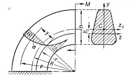 Розрахунок кривих брусів малої кривини виконують за формулами для прямого бруса (див. деформація згину). Для кривих брусів великої кривини з поздовжньою площиною симетрії, в якій діють зовнішні навантаження, нормальні напруження визначають за формулою: