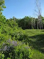 Масив складається з окремих ділянок, утворених однією, двома деревними породами, які чергуються з різнотрав'ям, галявинами, чагарниковими заростями. Найбільшу частину утворено насадженнями дубу, берези, липи, кленів гостролистих і татарських, несправжньоплатанового та долоне розрізного і масового — в'язу гладкого. Хвойні рослини дендропарку — сосна звичайна, туя західна, ялівець звичайний, ялівець козацький. Деревні листяні породи: айлант найвищий, маклюра яблуконосна, сумах коротковолосистий, скумпія звичайна, абрикос звичайний, горіх волоський та чорний, ліщина звичайна, бархат амурський; серед плодових дерев необхідно зазначити яблуню лісову, грушу звичайну, обліпиху крушиновидну, а також горобину звичайну. У південній та східній частині є рідколісся з маслинки вузьколистої. Значні площі займають насадження айви подовженої; глоду криваво-червоного та пятистовпчикового, одноматочкового; барбарису звичайного. Зрідка зустрічаються черемха звичайна та пізня, кизил справжній, ірга овальна, алича.