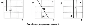 Крива λ, що зображена ламаною лінією, характеризує матеріал, який не містить зростків і в процесі збагачення ідеально розділяється на два продукти (рис. 2 а). Якщо крива λ має вигляд прямої лінії, нахиленої під деяким кутом φ, це означає, що матеріал містить значну кількість зростків при нерівномірному вкрапленні корисного мінералу, збагачуваність такого матеріалу винятково важка (рис. 2 б). Якщо крива λ зображена вертикальною прямою (φ = 90о), матеріал збагатити неможливо, тому що вся його маса складається із найтонших зростків мінералів, що не руйнуються при подрібненні (рис. 2 в).