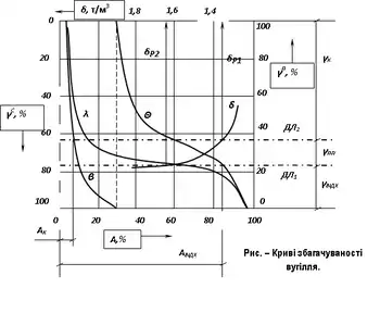 - 3 - виходу потонулих фракцій від їх зольності - крива важких фракцій або крива середніх зольностей відходів θ;