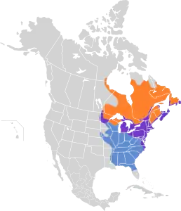 Крижень американський гніздиться на сході Канади та північному сході США. На зимівлю перелітає у південно-східні штати, інколи на Бермуди, Багами та Малі Антильські острови. Як залітний вид подеколи реєструється у Мексиці, Західній та Північній Європі.