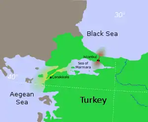 ![]() Положення проток Босфор (червона) і Дарданелла (жовта) Положення проток Босфор (червона) і Дарданелла (жовта) | |||||||