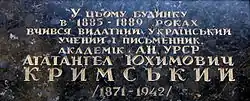 - У 1971 році на честь Агатангела Кримського встановлено меморіальну дошку на колишньому будинку Колегії Павла Ґалаґана (нині це Музей літератури, вул. Б.Хмельницького, № 11).