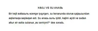 • «KÖYLİ VE SU ANASI: Bir köyli baltasını özenge tüşürgen, su kenarında oturub qayğısından ağlamağa başlağan edi. Su anası bunı işitdi, köylini acidi ve sudan altın bir balta çıkarıb „bu seniñmi?“ deb soradı.»