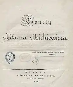 «Кримські сонети», для яких поет обрав форму італійських сонетів, вперше були надруковані у грудні 1826 р. в Москві, а через кілька місяців з'явився переклад на російську мову, що дав змогу перекладачеві назвати Міцкевича уособленням літературної слави і порівняти деякі його сонети «з найкращими строфами Байрона».