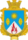 В лазуровому срібне укорочене вістря, обтяжене червоним полум'ям, супроводжуване угорі золотим шістнадцятипроменевим сонцем, по сторонам – золотими дубовими листками. Щит вписаний у декоративний картуш і увінчаний золотою сільською короною. Унизу картуша напис «КРИНЦІЛІВ».