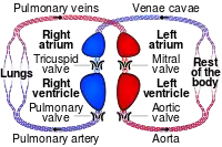 Таким чином, кров рухається великим колом кровообігу від лівого шлуночка до правого передсердя, а потім малим колом кровообігу від правого шлуночка до лівого передсердя.