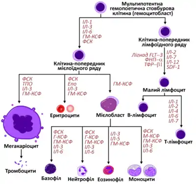 | Основні цитокіни задіяні у кровотворенні [4][5] | |||