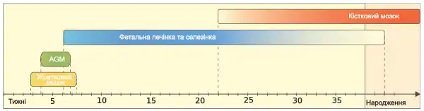 У ссавців наступним місцем кровотворення є ділянка, що оточує дорзальну аорту, її називають AGM (від англ. aorta-gonad-mesonephros, аорта-гонади-мезонефрос), тут починається дефінітивний (остаточний) гемопоез. У людини гемопоез в ділянці дорзальної аорти триває від 27 до 40 дня ембіріогенезу [3]. Незабаром гемопоетичні стовбурові клітини мігрують у печінку та селезінку зародка, які є основними місцями кровотворення від 6 тижня до 6-7 місяця ембіріонального розвитку, продукування клітин крові на низькому рівні тут продовжується до 2-ох тижнів після народження [2]. Кістковий мозок стає основним місцем геомопоезу на 6-7 місяць розвитку зародка, а до кінця першого місяця постнатального періоду залишається єдиним місцем, в якому утворюються нові формені елементи крові.
