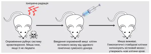 Завдяки самовідновленню кількість гемопоетичних стовбурових клітин залишається приблизно сталою впродовж всього життя особини. Проте, коли організм потребує швидких темпів кровотворення, ГСК можуть демонструвати величезну проліферативну активність. Ця їхня властивість може бути продемонстрована у досліді із мишами, яким повністю руйнують систему кровотворення, шляхом опромінення летальною дозою радіації (950 рад). Опромінені миші помирають за 10 днів, якщо їм не пересадити нормальні клітини кісткового мозку від генетично сумісного донора. Хоча нормальна миша має 3×108 клітин кісткового мозку, введення тільки 104-105 донорських клітин (тобто 0,01-0,1% від нормальної кількості) є достатнім для повного відновлення системи кровотворення, що доводить величезну здатність стовбурових клітин до проліферації та диференціації [4].