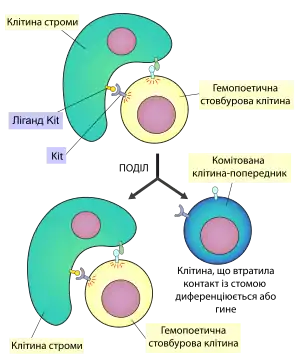 Клітини строми, зокрема остеобласти, також потрібні для підтримання гемоцитобластами статусу недиференційованих стовбурових клітин. Гемопоетичні стовбурові клітини можуть існувати у кістковому мозку тільки в окремих нішах, що створюються стромою. Основна властивість цієї ніші полягає у тому, що мікрооточення стимулює в ГСК сигнальний шлях Wnt (шлях, необхідний для підтримання стовбуровості). Також були виявлені інші сигнальні шляхи, задіяні в цьому процесі. Зокрема у мишей із специфічним синдромом, що включав анемію внаслідок нестачі еритроцитів, стерильність через відсутність гамет та нестачу пігментних клітин, спостерігались мутації у одному із двох генів: гені рецепторної тирозинкінази Kit або її ліганду. Було встановлено, що ліганд Kit експресується на поверхні стромальних клітин, і повинен бути мембранозв'язаним для того, щоб виконувати свою роль у підтриманні популяції стовбурових клітин. Інша назва цього білка - фактор стовбурових клітин (англ. Stem cell factor, SCF), він також може існувати і в розчинній формі, діючи не тільки не гемоцитобласти, а й на більш диференційовані клітини [8]. Рецепторна тирозин-кіназа Kit присутня на поверхні стовбурових клітин (зокрема ГСК)[5].