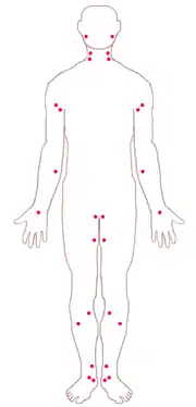 - Пахвова артерія. Її притискують до голівки плечової кістки, при рані в області середньої або нижньої третини плеча, для цього, опираючись одним пальцем на верхню поверхню плечового суглоба, іншими пальцями здавлюють артерію.