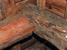 - У дерев'яних брущатих або ж рублених будівлях — на верхні вінці,