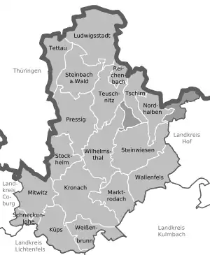 Район складається з 4 міст (нім. Städte), 7 торговельних громад (нім. Märkte) та 7 громад (нім. Gemeinden):