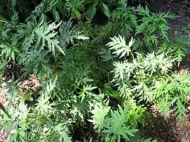 Листки великі, довжиною до 15 см, глибоко пальчасто-3–5-роздільні, з перистонадрізаними частками, зубчасті, на черешках.