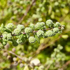 Однорічна чи дворічна рослина. Стебло заввишки 30–75 см. Листки широко-яйцеподібні, довжиною 2–6 см. Суцвіття кулясті, на довгих тонких ніжках[1]. Рослина до 100 см завдовжки, трав'яниста, з рідкісними жалкими волосками. Стебло чотирикутне. Сім'янки широко яйцеподібні, ≈2.5 мм довжиною й ≈2 мм завширшки, темно-коричневого забарвлення[3].