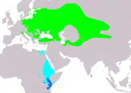 Вид поширений спорадично, більш численний на півдні ареалу. Ареал: Західна Євразія від північно-східної Франції, Швейцарії і північної Італії на схід до долини Шегарки (басейн верхньої Обі), Західного Саяну, Тувинської угловини, угтловини Великих Озер у північно-західній Монголії і по Монгольському Алтаю ймовірно до східного краю Гобійського Алтаю. На північ до Данії, північної Швеції, Фінської затоки, в європейській частині Росії до 60-ї паралелі, далі на схід на півночі до Західного Саяну. На південь до Північної Італії, північної Греції, південної Болгарії, в Малій Азії на південь до 40-ї паралелі, до південної межі Вірменького нагір'я та ймовірно Ельбрусу. На схід від Каспійського моря в західному і центральному Казахстані, на південь до 48-ї паралелі. Від центральної частини Казахського дрібносопочника південна межа ареалу завертає на південь і простягається через дельту Ілі, західне підніжжя Тянь-Шаня, західне підніжжя Паміро-Алтайської системи і Паропаміза, охоплює ці гірські країни з півдня і від західного Гіндукуша через західний Сіньцзян продовжується до східної межі Гобійського Алтаю. У межах окресленої центральноазійської частини ареалу пустельні простори Такла-Макана і Джунгарії цим видом не заселено. Гніздиться на деяких островах Балтійського моря.[3]