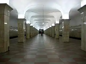 Конструкція станції — колонна трипрогінна мілкого закладення (глибина закладення — 13 м). Побудована за спеціальним проєктом з монолітного бетону. Станція розрахована на великий пасажиропотік, але в даний час її величезний зал завантажений слабо.