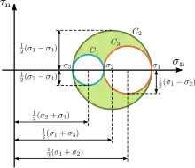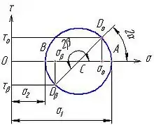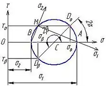 На графіку відкладають відрізки в певному масштабі: та .Знаходимо т. як центр відрізка і будуємо круг Мора як показано на малюнку. Потім із центра відкладаємо кут на перетині промення із колом буде точка . Ордината точки буде дотичне напруження а абсциса нормальне напруження . Аналогічно знаходиться напруження у площині .Слід мати на увазі що площини взаємно перпендикулярні.