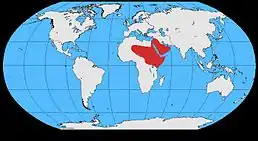 Вид зустрічається в арідних районах на Близькому Сході, Аравії, Кенії та Судані.