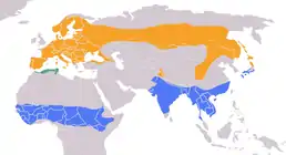 У Північній Африці — північно-східний Алжир та прилеглі частини Тунісу. Євразія від атлантичного узбережжя на схід до басейну Колими та, південніше, до тихоокеанського узбережжя. На північ у Скандинавії до 67-ї паралелі, до південної частини Мурманської області, на схід в Європейській частині Росії до 65-ї паралелі, в Західний СибірЗахідному Сибіру до 64-ї паралелі, в долині Єнісею до 66-ї паралелі, в долині Хатанги та Лени до 68-ї паралелі, в долині Колими до 68-ї паралелі. На південь до Середземного моря, Малої Азії, північно-західного Ірану, південнокаспійських провінцій Ірану. На схід південна межа проходить в долині Волги в області 49-ї паралелі, в долині Уралу по 50-й паралелі, в Північному Казахстані в області 51-ї паралелі та далі вид поширений на південь від Семипалатинська, південно-західного Алтаю, Хангая, Хейлунцзяна, північної частини Корейського півострова. Ізольовані ділянки охоплюють Кашмір на захід від Читрала та гірські області середнього Китаю — Ганьсу, східний та південний Цинхай, північну Сичуань. Острови: Сицилія, Сардинія, Корсика, південно-східна Велика Британія, Шантарські, Сахалін, Шикотан, Кунашир, Хоккайдо. Зимує в тропіках Африки й Азії.